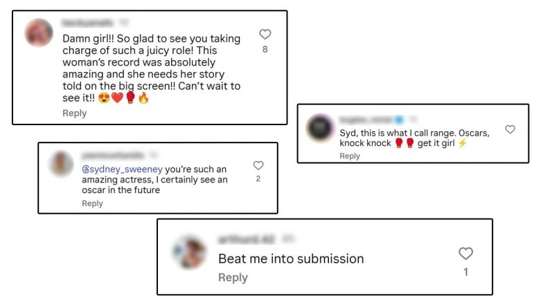 As soon as the first look of Sydney Sweeney as Christy Martin was shared, fans took to the comment section to share their thoughts. Many reminisced about the actress’ signature blonde hair and showered praise on her for the mind-blowing transformation. Others applauded her fierce avatar and even demanded an Oscar for her performance already. A few fans jokingly called themselves punching bags, just to be smashed by the gorgeous diva.