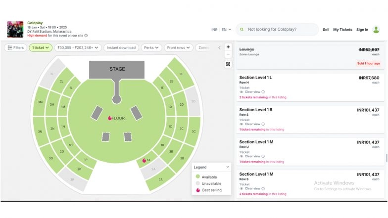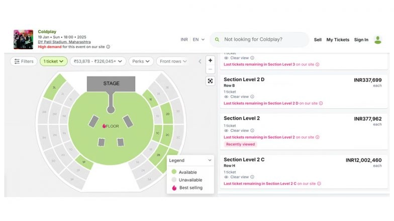 Coldplay is finally hitting India after a whopping nine years, bringing their 'Music of the Spheres World Tour' to Mumbai in January 2025! The hype went through the roof when tickets dropped at noon on Sunday (September 22), causing server crashes and a sell-out faster than you can say "Yellow!" Fans were totally vibing—thrilled yet shocked by the chaos! Amid the ticket madness, resale sites jumped in, with prices shooting up to nearly INR 12 lakh for just one pass. Yup, you heard that right! A little digging showed that tickets that were only INR 12,500 on BookMyShow are now listed for mind-blowing sums on Viagogo. With the availability dwindling to almost nothing, the demand is absolutely wild! Coldplay’s comeback is shaping up to be an epic event, and fans are so ready to soak in that magic once again! Coldplay India Concert 2025 Tickets Go Live on BookMyShow: Here’s a Look at the Ticket Prices and Seating Layout.