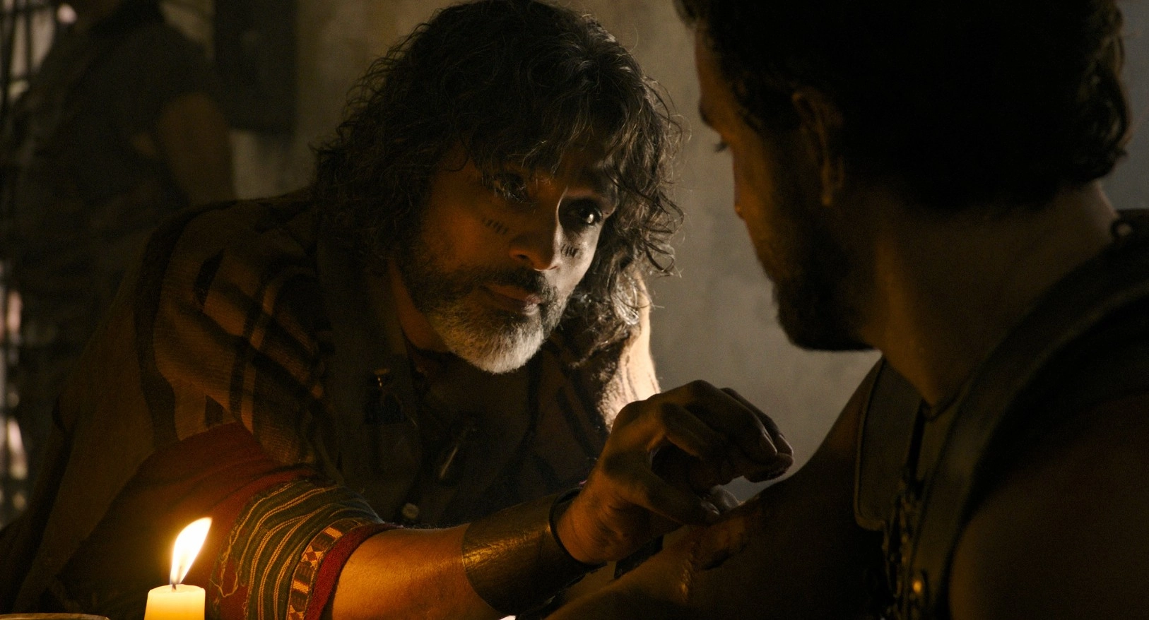 Lucius quickly forms a close bond with Ravi, who is older, and there is a subtle undertone of homoeroticism in their playful interactions. Ravi plays an essential role in Lucius’ journey, beyond merely tending to his wounds. He guides Lucius to Maximus’ underground grave, where Lucius retrieves his father’s armour and sword, which he later dons during the climactic battle.