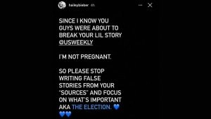 A leading Hollywood publication was going to publish a story about Hailey's pregnancy but she did not want to beat around the bush anymore. The model took matters in her hand and finally put a stop on these rumours. She took to social media to post a story where she bashed the publication for putting out a false story. She asked them to rather focus on the US Election and not publish false stories.