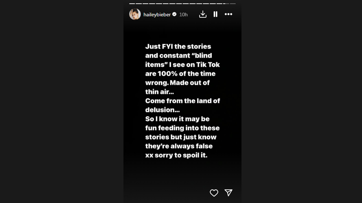 Hailey recently took to the Stories section of her Instagram and shared a no-nonsense statement. Addressing the social media posts about her life with Justin Bieber, she wrote, “Just FYI, the stories and constant ‘blind items’ I see on TikTok are 100% of the time wrong Made out of thin air… Come from the land of delusion (sic)."