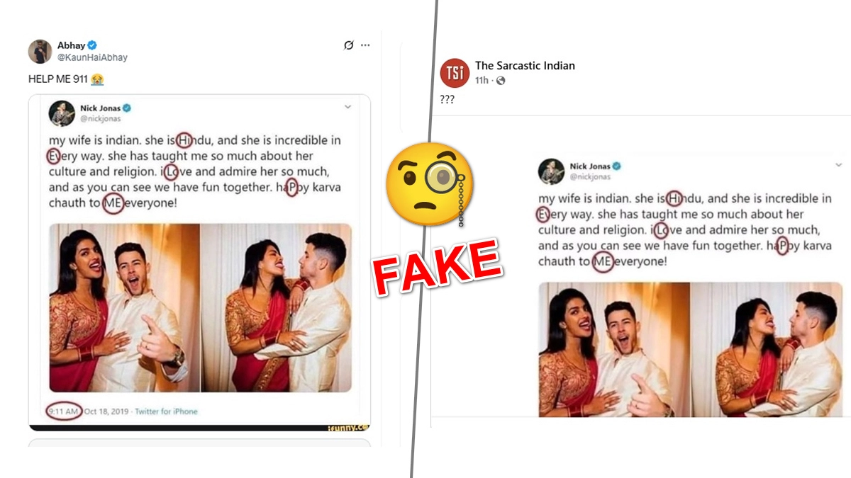 Is there trouble in paradise for Priyanka Chopra Jonas and Nick Jonas? Is he unhappy in his marriage to a Hindu wife, with whom he shares a toddler daughter, Malti Marie Chopra Jonas? Did Priyanka Chopra’s husband, Nick Jonas, give out a secret message saying 'HELP ME 911' about his marriage through a tweet on October 18, 2019? Social media posts by the Twitter/X handle @KaunHaiAbhay and Facebook page The Sarcastic Indian have shared a screenshot of a tweet attributed to Nick Jonas, where he has allegedly sent out a message calling for help in his relationship with his Hindu wife, Priyanka Chopra. LatestLY carried out a Fact Check, and we have come to a conclusion based on the proof collected. Read on to know about our findings. Priyanka Chopra and Nick Jonas Share Romantic Kiss on the Beach! Couple’s Dreamy Video Set to Jonas Brothers New Song ‘I Can’t Lose’ Is All That We Want (Watch).