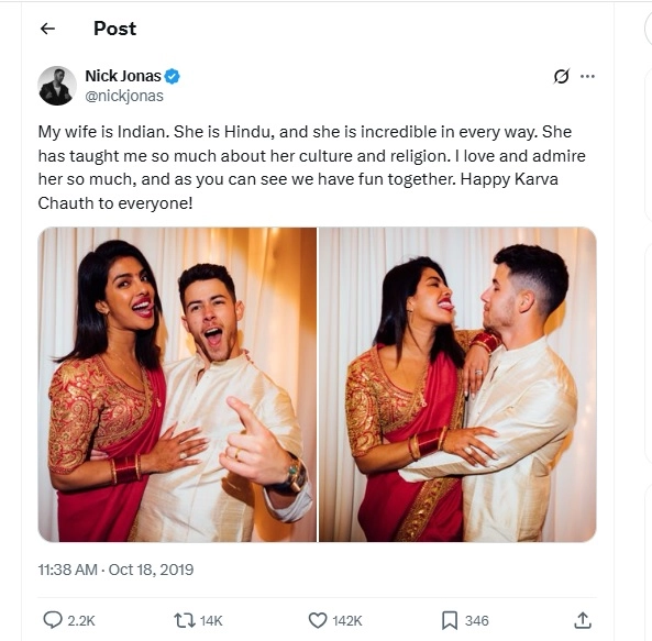 Here’s what Nick Jonas actually said that day in his tweet on X: “My wife is Indian. She is Hindu, and she is incredible in every way. She has taught me so much about her culture and religion. I love and admire her so much, and as you can see we have fun together. Happy Karva Chauth to everyone!” So, the original tweet did not have any capital letters calling for help, and no ME added there in the Karva Chauth wish. Here is the original Twitter post by Nick Jonas on October 18, 2019.