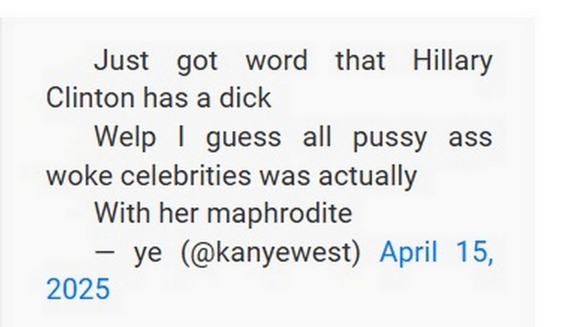 After the conspiracy theory claiming former US First Lady Michelle Obama is a man or transgender woman married to former US President Barack Obama, now comes the new theory of Hillary Clinton’s sex at birth. Kanye West, in his tweet dated April 14, 2025, posted at 9:45 AM, wrote, “Just got word that Hillary Clinton has a d*ck Welp I guess all p***y a** woke celebrities was actually With her maphrodite.” (sic) A hermaphrodite is someone – “a person, an animal or a flower” – that has “both male and female sexual organs or characteristics”, as per the Oxford Languages Dictionary.