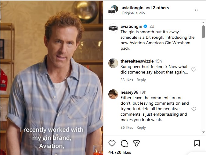 The official Instagram page of Aviation American Gin shared a new video featuring the face of the brand, actor Ryan Reynolds. The video shows a collab of two of his brands, Aviation Gin and Wrexham AFC and in his true funny guy avatar, the actor takes you through the ad, which was shared along with the caption, “The gin is smooth but it’s away schedule is a bit rough. Introducing the new Aviation American Gin Wrexham pack. [sic]” So far, so good. However, the comments section did not match Ryan Reynolds’ mood! It was bad (read: bloodbath)!