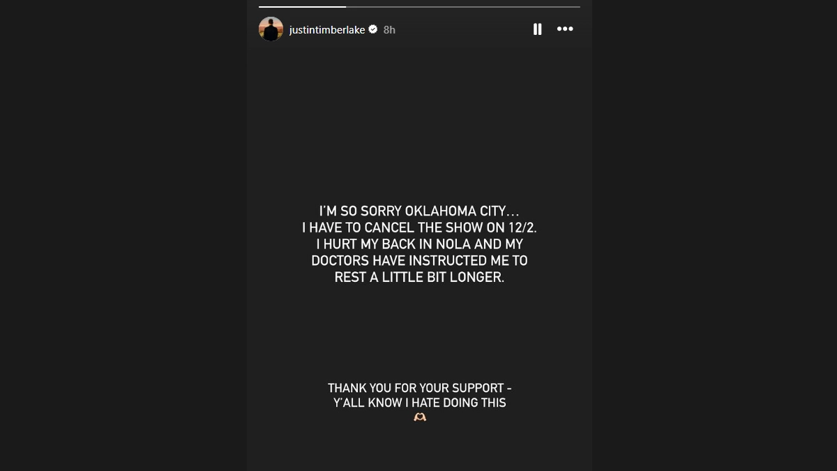 Justin Timberlake has once again cancelled another stop on his Forget Tomorrow World Tour after sustaining a back injury during his recent performance in New Orleans. The singer announced via his Instagram Story that the upcoming show in Oklahoma City, scheduled for December 2, would no longer take place. “I’m so sorry Oklahoma City…I have to cancel the show on 12/2. I hurt my back in NOLA and my doctors have instructed me to rest a little bit longer. Thank you for your support—ya’ll know I hate doing this,” Timberlake shared with his fans. Justin Timberlake Postpones Upcoming Shows Due to Bronchitis and Laryngitis; Announces New Concert Dates for Fans (View Post).
