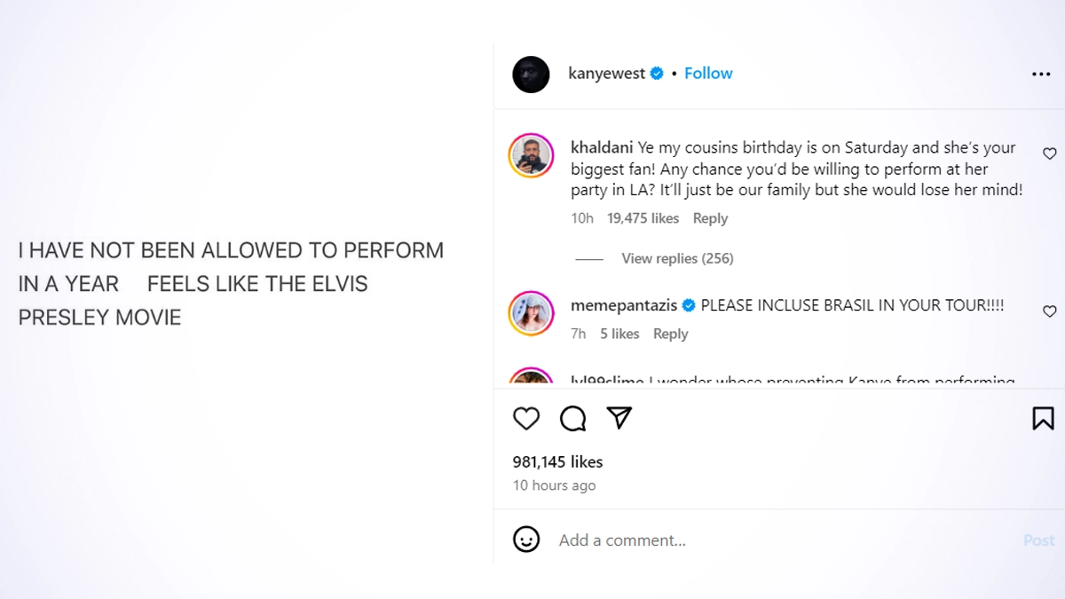 He uploaded a black-and-white photo featuring a message that read, "I HAVE NOT BEEN ALLOWED TO PERFORM IN A YEAR. FEELS LIKE THE ELVIS PRESLEY MOVIE.” He seemingly was making a reference to Elvis being banned from gigs due to his provocative performances.