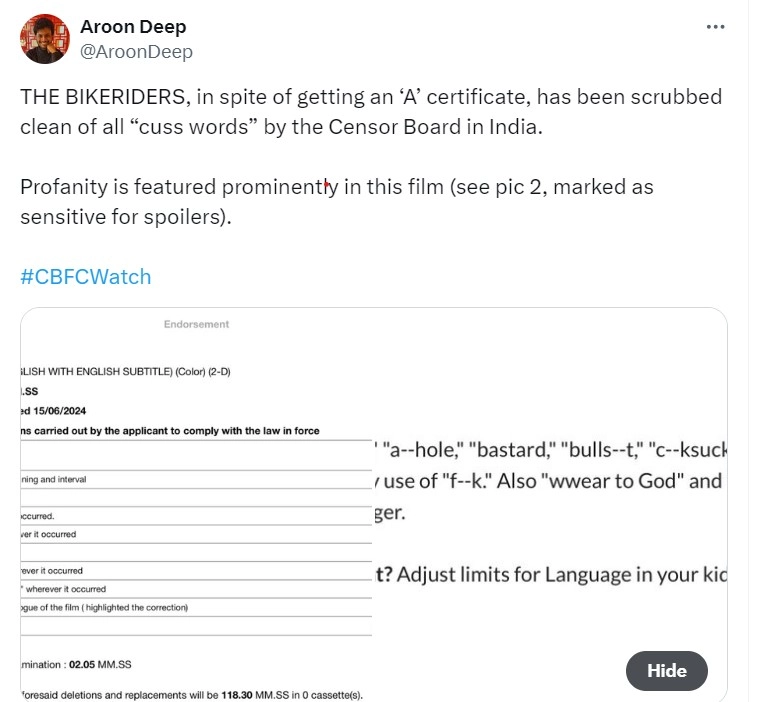 The Bikeriders revolves around a motorbike gang from the '60s called the Vandals, and the film represents their dynamics with each other. Some of the language used between the characters come across as uncouth and cuss-filled, however, for a film that is certified Adults Only, it feels bizarre to see these recommended cuts. As for the 'middle finger' diagram that caught Censor Board's attention, that appears on the jackets of the Vandals.