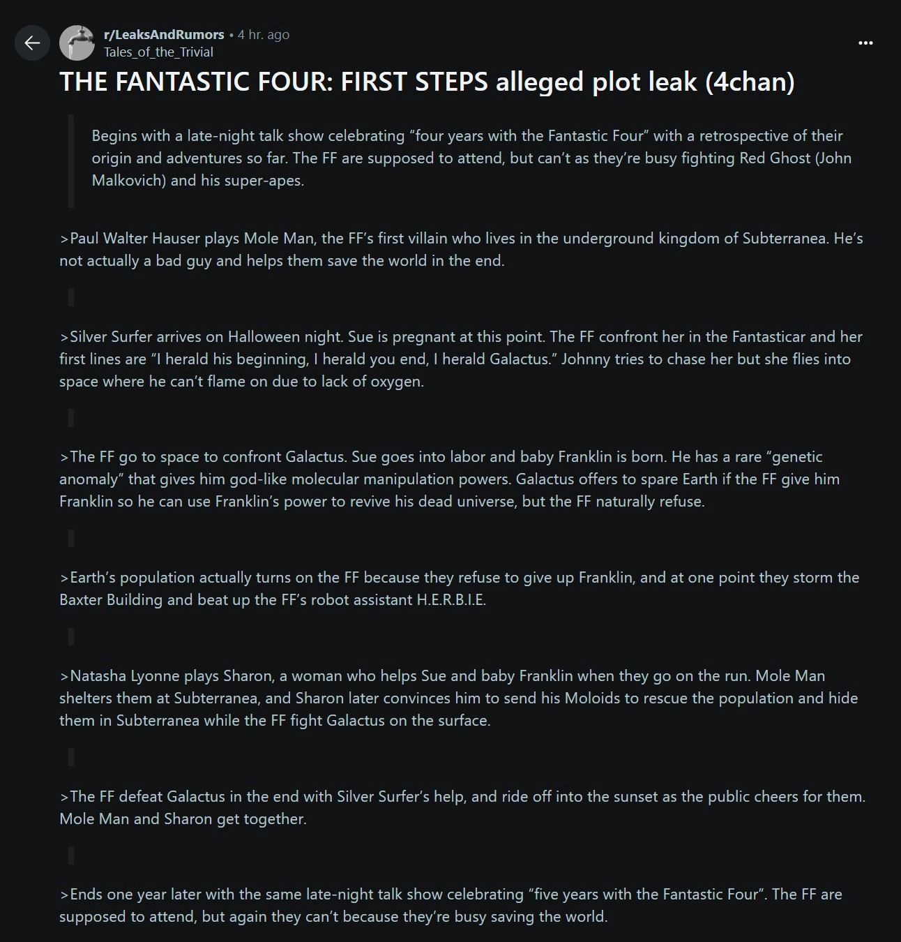 The alleged leak also conflicts with an earlier rumour suggesting Galactus would defeat the team, forcing them to flee to Earth-616 (the primary MCU universe) to warn other heroes of his threat.