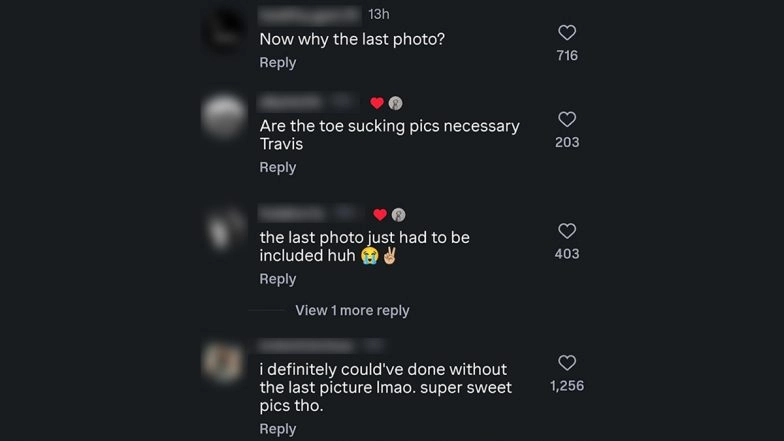 The reaction from the public was swift. Within hours of the post, fans flooded the comments section to express their discomfort."The last photo just had to be included, huh?" noted one commenter. Others were more blunt, with some calling the post "disrespectful" to Kardashian’s older children, Mason, 15, Penelope, 13, and Reign, 10, who may see the content online. One viral comment stated, "Are the toe sucking pics necessary, Travis?"