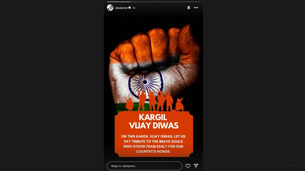 Stories of their valour will be repeated year after year. Jai Hind!" Veteran actor Anupam Kher took to Instagram and shared a video with a message: "Kargil diwas ki 25th anniversary par bhartiya sena ko badhai aur yudh me shahid hue shoorveeron ko aur unke parivaar walon ko mera natmastak naman.. Jai Hind (On the 25th anniversary of Kargil Vijay Diwas, congratulations to the Indian Army and my deepest respects to the brave soldiers who were martyred and their families. Jai Hind)." The post was captioned: "Bhartiya sena ki jai ho #25yearsofkargilvijay." Rakul Preet Singh posted on her Instagram stories: "On this Kargil Vijay Diwas, let us pay tribute to the brave souls who stood fearlessly for our country's honour." Celina Jaitly wrote on her Instagram stories: "Echoes of bravery. Families remembering the Kargil heroes." Kargil Vijay Diwas 2024 Images and HD Wallpapers for Free Download Online: Patriotic Quotes and Heartwarming Messages To Celebrate Kargil War Victory Day.