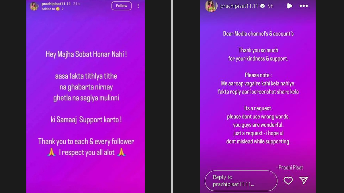 On May 26, in a post on her Instagram Stories, the actress thanked the media for their support, but denied making any "accusations" against Sudesh Mhashilkar. Prachi wrote: “Dear media channels & accounts Thank you so much for your kindness & support. Please note: Me aaroap vagaire kahi kela nahiye. fakta reply aani screenshot share kela (I haven’t made any accusations. I just shared screenshots of my reply. It's a request. Please don’t use wrong words. You guys are wonderful, just a request - I hope ul (you all) don’t mislead while supporting."