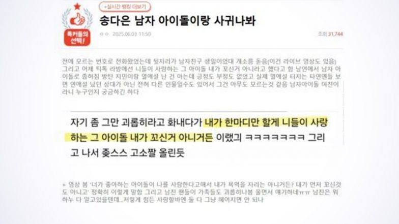 A post shared on the online forum Nate Pann on June 3 claimed that Song Da Eun admitted during a live broadcast that she is in a relationship with a male idol. The post quickly gained attention due to her past links with BTS member Jimin and went viral across multiple social media platforms. While she confirmed being in a relationship, the actress also opened up about the emotional stress she has been experiencing because of the negative comments from the fans, who are accusing her of various reasons.