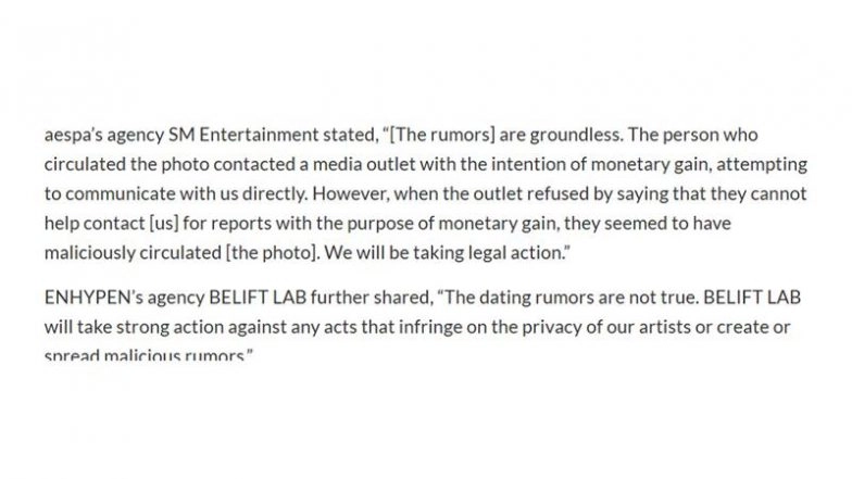 Dating rumours have always grabbed attention when it comes to South Korean celebrities, whether they are actors or K-pop stars. It seems K-fans simply can't get enough of their favourite stars' lives. The more, the merrier – and with that comes the rumours. Currently, social media is buzzing with dating rumours involving aespa’s Winter and ENHYPEN’s Jungwon, which have gone viral. A post on X (formerly known as Twitter) claimed there was evidence that the pair had been spotted at the same bar in the Cheongdam neighbourhood. South Korea on December 11. It was alleged that although they left the venue separately, they had been together. Jungwon was reportedly seen all covered up. But the K-pop star agencies refute claims of their dating. aespa’s Winter and Bang Ye Dam Share a Mysterious Glance in New Concept Photos of Their Upcoming Single ‘Officially Cool’ Releasing On April 2 (View Pics).
