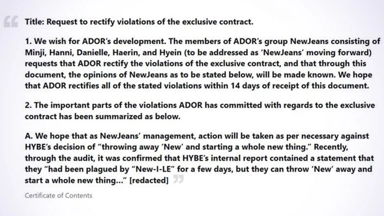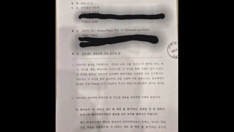 Things are getting rougher by the day with the K-pop all-girl group NewJeans and their agency, ADOR. After NewJeans' singer Hanni confessed to the National Commission against the mistreatment of K-pop stars, many issues have come to light. Whether it's HYBE's apology for the industry evaluation report revealed during the Culture, Sports, and Tourism Committee's National Assembly audit on October 24—causing an uproar within the K-pop community—or the shunning of BTS's V (Kim Taehyung) and his promotions, or even the attitude towards SEVENTEEN, Stray Kids, or BLACKPINK's Lisa, the situation has been tense. Now, new reports have emerged, revealing that NewJeans served a certificate of contents to ADOR on November 13. NewJeans Criticise New ADOR Management, K-Pop Girl Group Demand Restoration of Min Hee Jin’s System and Demand HYBE To Back Off - Reports.