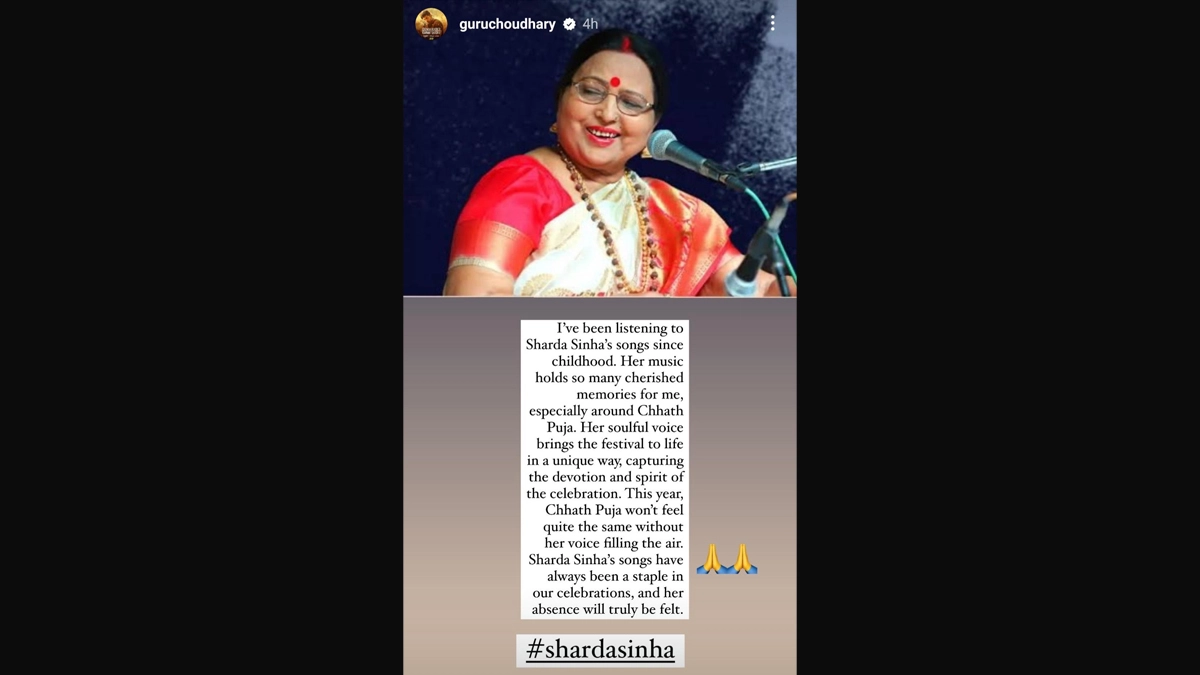 The actor shared: “I’ve been listening to Sharda Sinha’s songs since childhood. Her music holds so many cherished memories for me, especially around Chhath Puja. Her soulful voice brings the festival to life in a unique way, capturing the devotion and spirit of the celebration.” “This year, Chhath Puja won’t feel quite the same without her voice filling the air. Sharda Sinha’s songs have always been a staple in our celebrations, and her absence will truly be felt.”