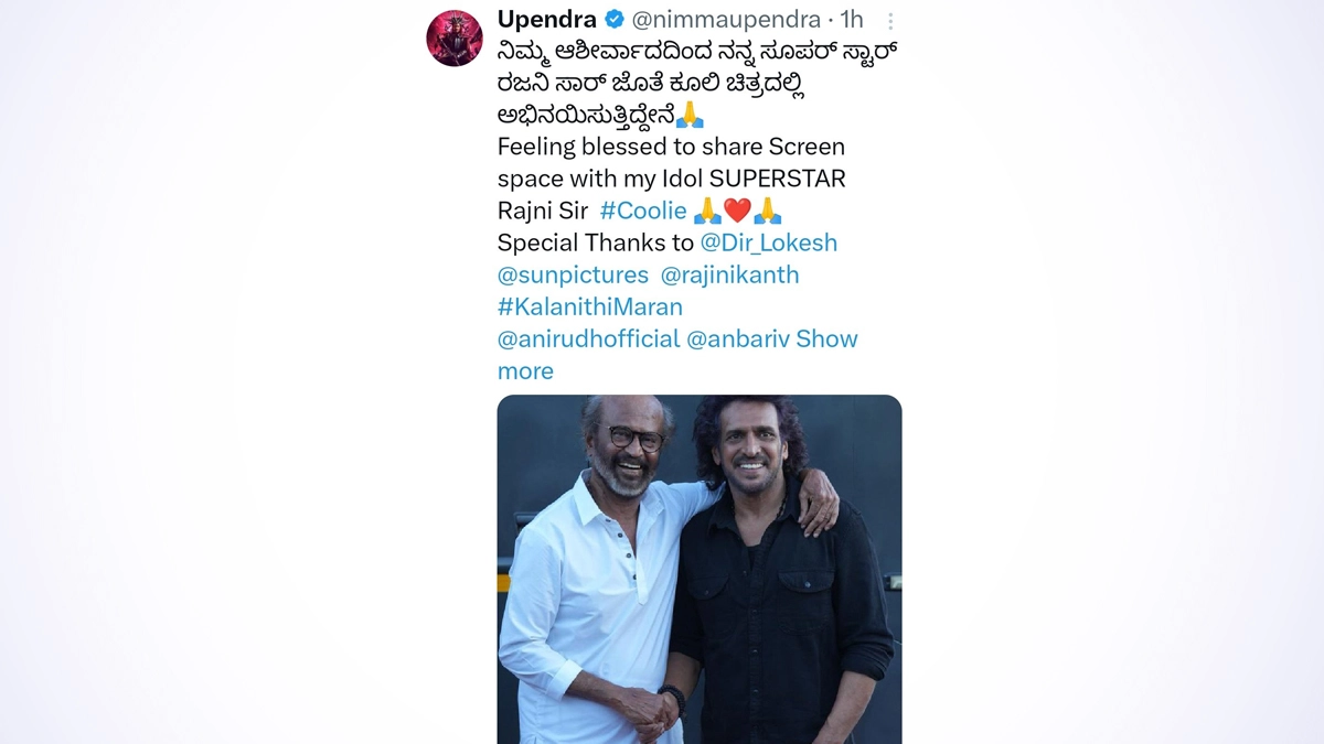 Upendra initially confirmed his casting in Coolie by sharing a photo with Rajinikanth on X, but he quickly deleted the post. This led to confusion among fans, who are now eagerly awaiting an official update on the Kannada superstar’s role in the film.