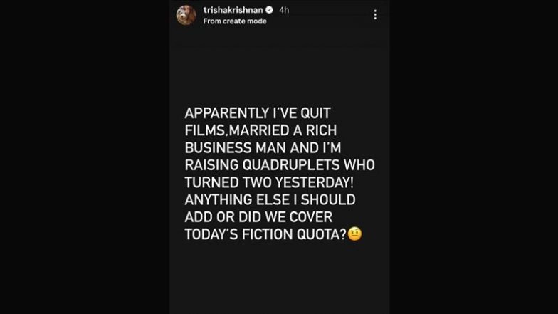 Addressing the claims on her Instagram Stories on Tuesday (April 7), Trisha used humour to shut down the narrative. "Apparently, I've quit films, married a rich businessman and I'm raising quadruplets who turned two yesterday! Anything else I should add or did we cover today’s fiction quota?" she wrote.