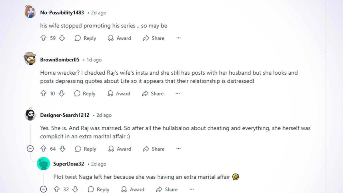 Neither Samantha Ruth Prabhu nor Raj Nidimoru have confirmed anything about the rumored relationship. However, Reddit users have discussed their possible relationship and the director’s dynamic with his wife amid the drama. One user even suggested that Naga Chaitanya, Samantha’s ex-husband, may have left her because of a possible extra-marital affair. Naga Chaitanya Breaks Silence on His Divorce from Samantha Ruth Prabhu Following Controversial Remarks by Telangana Minister Konda Surekha.