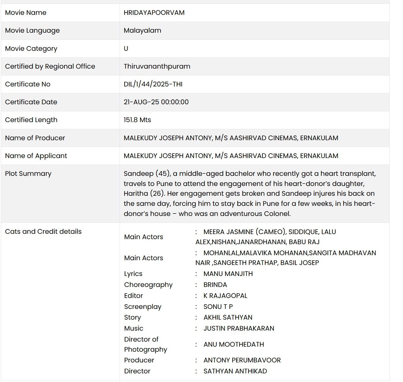 Hridayapoorvam has been awarded a U certificate by the CBFC, confirming its status as a complete family entertainer. The film has a confirmed runtime of 151 minutes, making it Mohanlal’s most family-friendly release of 2025, especially compared to Empuraan and Thudarum, which carried a U/A 16+ rating. ‘L2: Empuraan’ Censored: Mohanlal-Prithviraj Sukumaran’s ‘Lucifer’ Sequel Gets UA 16+ Rating; Runtime and Key Cuts Revealed – Read Deets.