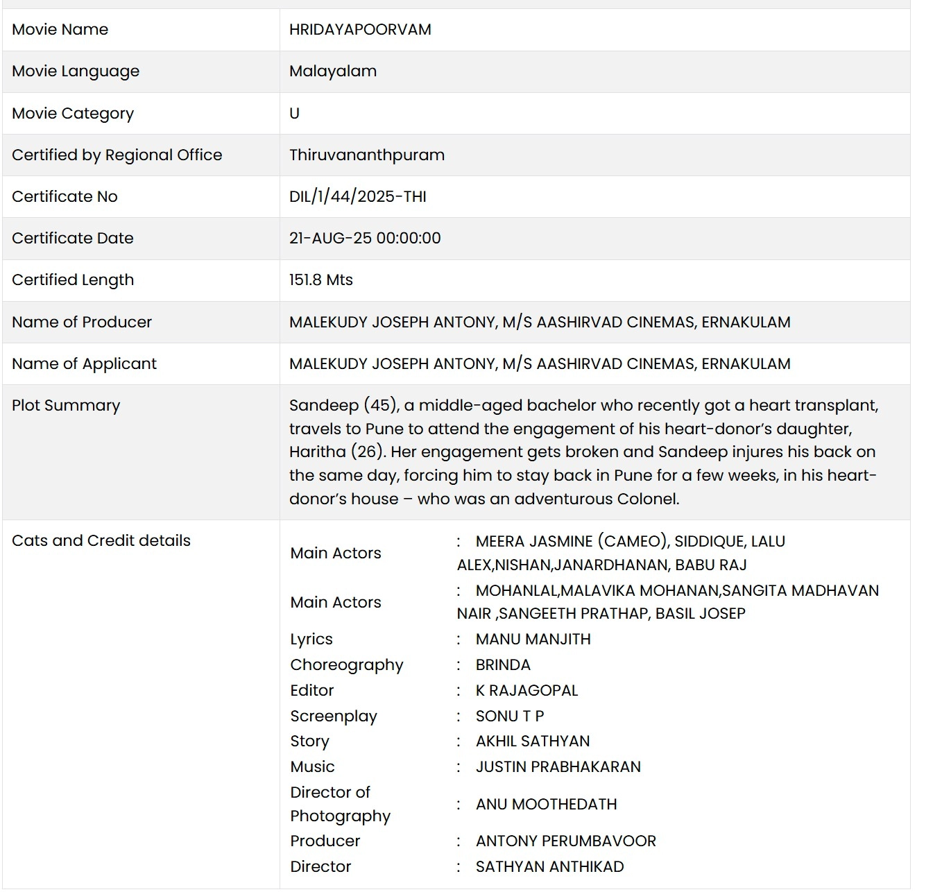 'Hridayapoorvam' CBFC Report