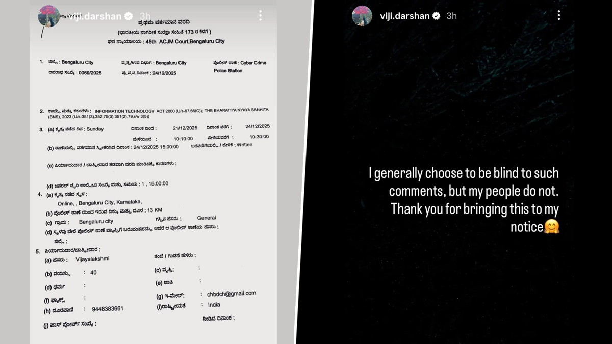After lodging the complaint, Vijayalakshmi left the premises without responding to the media. She also filed a complaint at the Bengaluru Police Commissioner's office, submitting screenshots of the hate comments she received along with details of the respective accounts, and urged the authorities to take action. The inspector of the cybercrime division accepted the complaint and assured her of appropriate action.