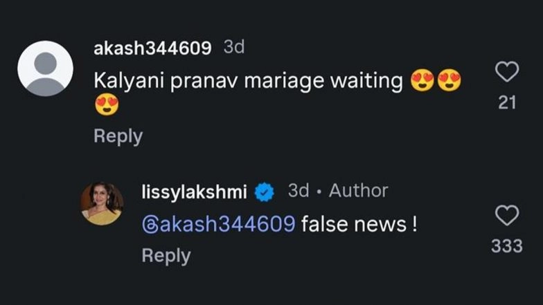 Veteran actress Lissy Lakshmi has stepped forward to address the intensifying social media rumours concerning a potential marriage between her daughter, actress Kalyani Priyadarshan, and Pranav Mohanlal. The interaction occurred this week during festive celebrations for Vishu, the Malayalam New Year, after a public comment on her personal social media page sparked renewed debate among fans. VIROSH Wedding: Kalyani Priyadarshan Recalls Rashmika Mandanna and Vijay Deverakonda’s Emotional Varmala Moment (View Post).