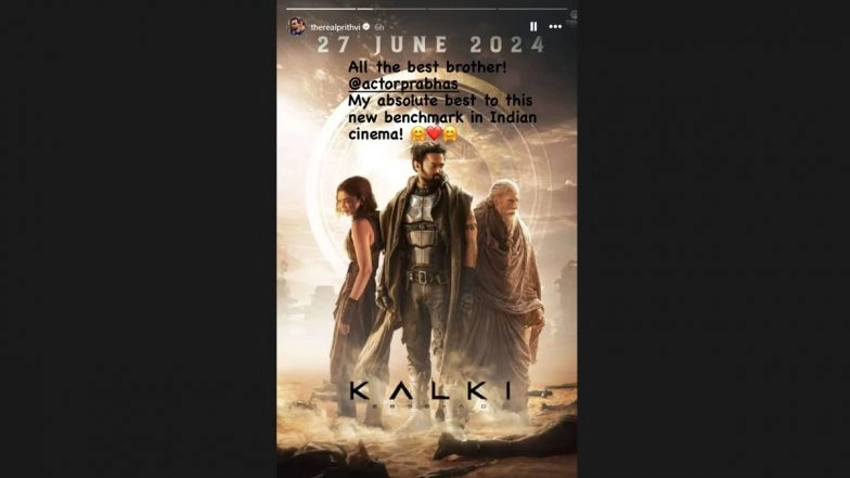 Ahead of the June 27 release of the much-anticipated multi-starrer sci-fi film Kalki 2898 AD, pan-India star Prithviraj Sukumaran on Wednesday wished the movie a great success. Taking to Instagram Stories, Prithviraj shared an image of Kalki 2898 AD and wrote: "All the best brother! @actorprabhas My absolute best to this new benchmark in Indian Cinema!" ‘Kalki 2898 AD’: Andhra Pradesh Government Permit Screening of 6th Additional Show of Prabhas-Nag Ashwin’s Sci-Fi Film – View Statement.