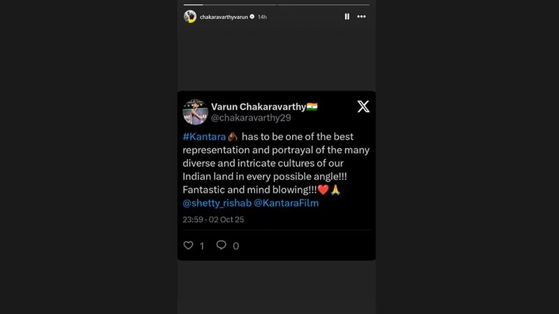 Team India cricketer Varun Chakravarthy has showered praise on director Rishab Shetty's just released pan-India film Kantara: Chapter 1, calling it "fantastic and mindblowing!" ‘Kantara: Chapter 1’ FIRST Review Out! Rishab Shetty, Rukmini Vasant, and Gushlan Devaiah Shine in This Mythological Action Thriller Prequel With Strong Performances and Goosebump-Evoking Moments.