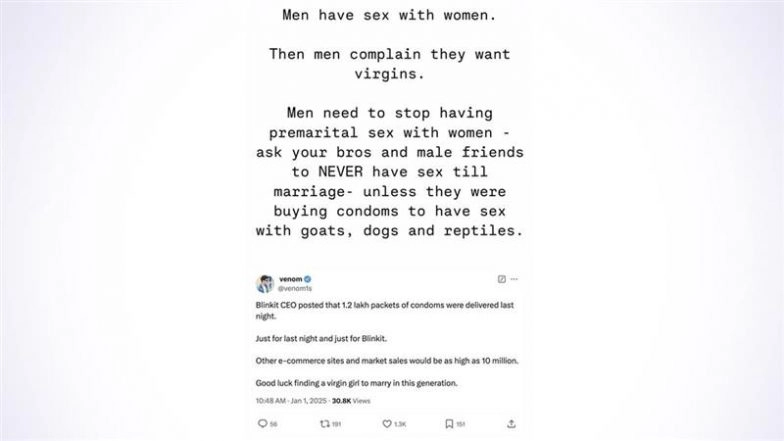 Nowadays, people often share their opinions on social media without a second thought. However, they may have to be on the receiving end of severe criticism due to the comments they make. Recently, a user named Venom shared a post on X (previously Twitter), which attracted severe criticism for its misogynistic tone. The user reacted to Blinkit CEO Albinder Dhindsa's post, which revealed that 1.2 lakh packets of condoms were delivered across India on New Year's Eve. Renowned playback singer Chinmayi Sripada was also among the ones reacting to the post and calling out the user for his controversial remark. ‘1,22,356 Packs of Condoms, 2,434 ENO’: Blinkit Achieves Record Milestones on New Year’s Eve Celebration: Highest Orders, Tips and More; Check Details.