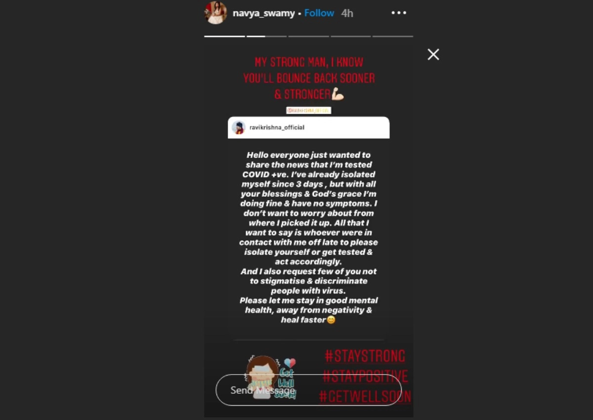 Navya Swamy, who is now home quarantined, extended her support to Ravi Krishna. She wrote, “My strong man, I know you’ll bounce back sooner and stronger. #StayStrong #StayPositive #GetWellSoon”.