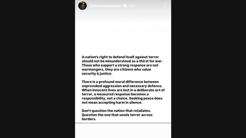 In the wake of tensions escalating between India and Pakistan, Malayalam actor Unni Mukundan has pointed out that questions must be asked to the nation that was sending terror across borders and not to the nation that was only retaliating. India Shoots Down Pakistan Air Force’s F-16 Fighter Jet, 2 JF-17 Aircraft After Pakistani Forces Attempt To Target Multiple Locations in Jammu and Punjab.