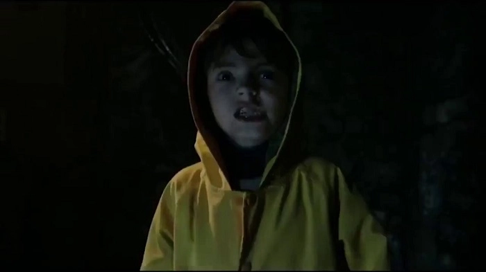 That yellow raincoat which that unfortunate kid is wearing looks to be a nod to the same coloured jacket that IT's first victim in the film, young Georgie, was wearing before he was taken into the sewers by the evil clown.