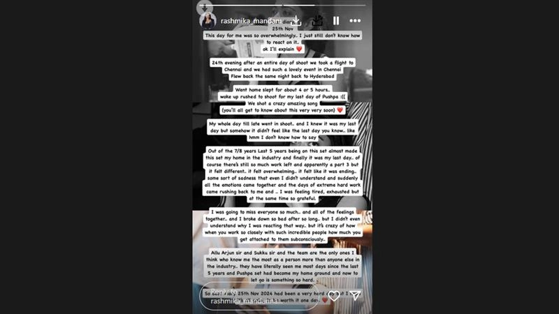 She wrote: “24th evening after an entire day of shoot we took a flight to Chennal and had such a lovely event in Chennai flew back the same night back to Hyderabad. Went home and slept for about 4 or 5 hours. woke up rushed d to shoot for my last day of Pushpa. We shot a crazy amazing song (you'll all get to know about this very very soon)”