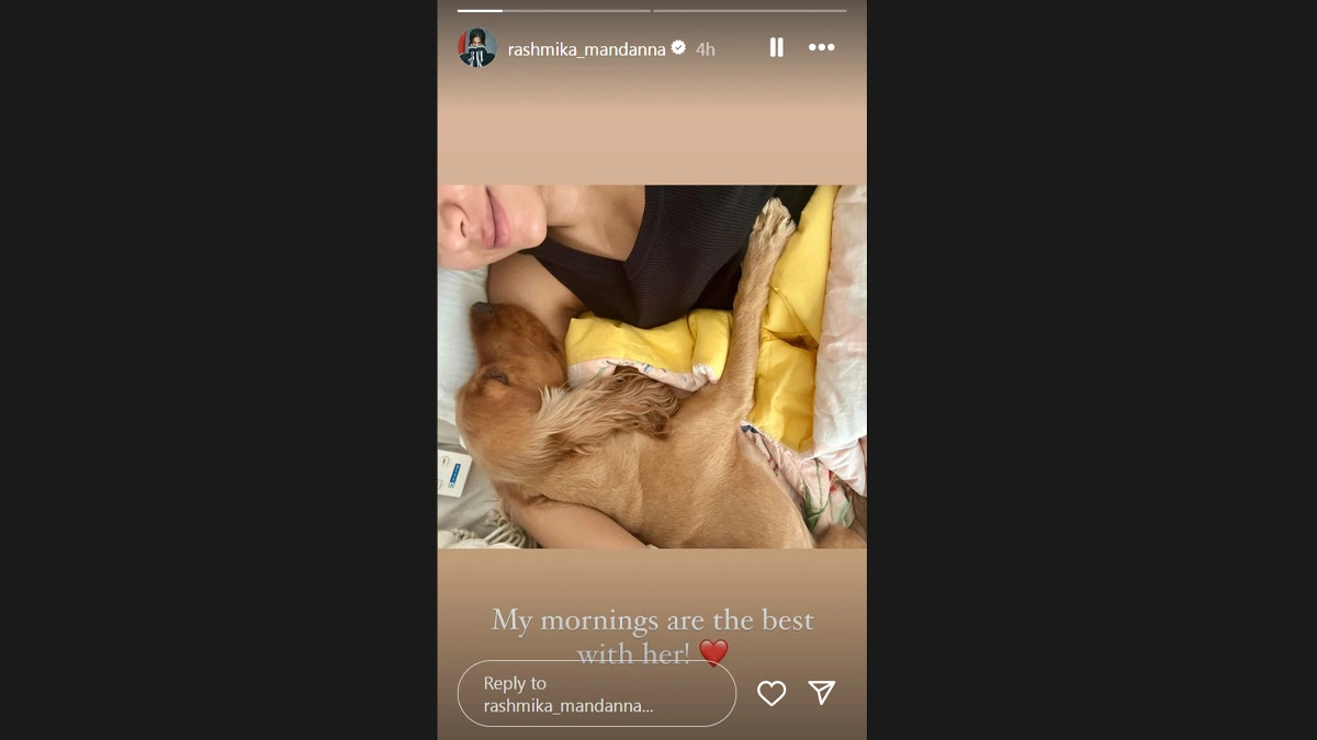 Actress Rashmika Mandanna took to social media to spill the beans about who makes her mornings the “best”. On Monday, Rashmika took to Instagram stories and posted a cheeky picture, featuring her and her furry-friend Aura. In the image, the two are cuddled up in bed. For the caption, she wrote: “My mornings are the best with her (heart emoji).” The Girlfriend: Rahul Ravindran Heaps Praises on Rashmika Mandanna for Dubbing in Five Different Languages; Teaser To Release on April 5!.