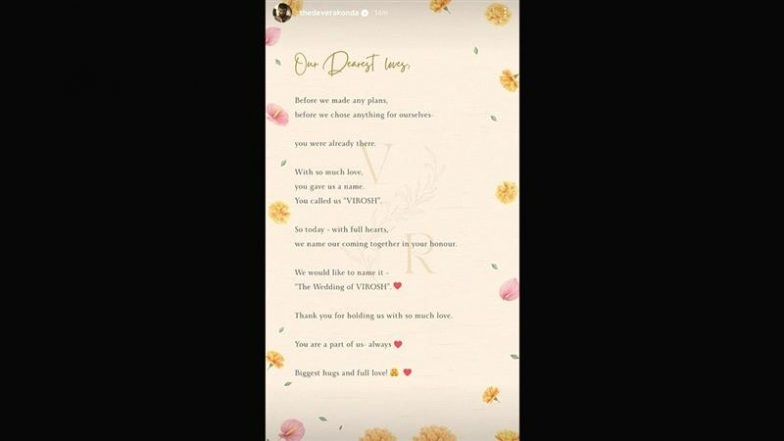 According to reports, Rashmika Mandanna and Vijay Deverakonda will get married in a traditional Telugu ceremony at around 10 am. This will be followed by a Kodava (Coorgi) wedding in the evening at around 4 pm. Vijay Deverakonda Shares Pics of Haldi Ceremony With Rashmika Mandanna, ‘Rushie’ Touch Melts Fans’ Hearts (View Posts).