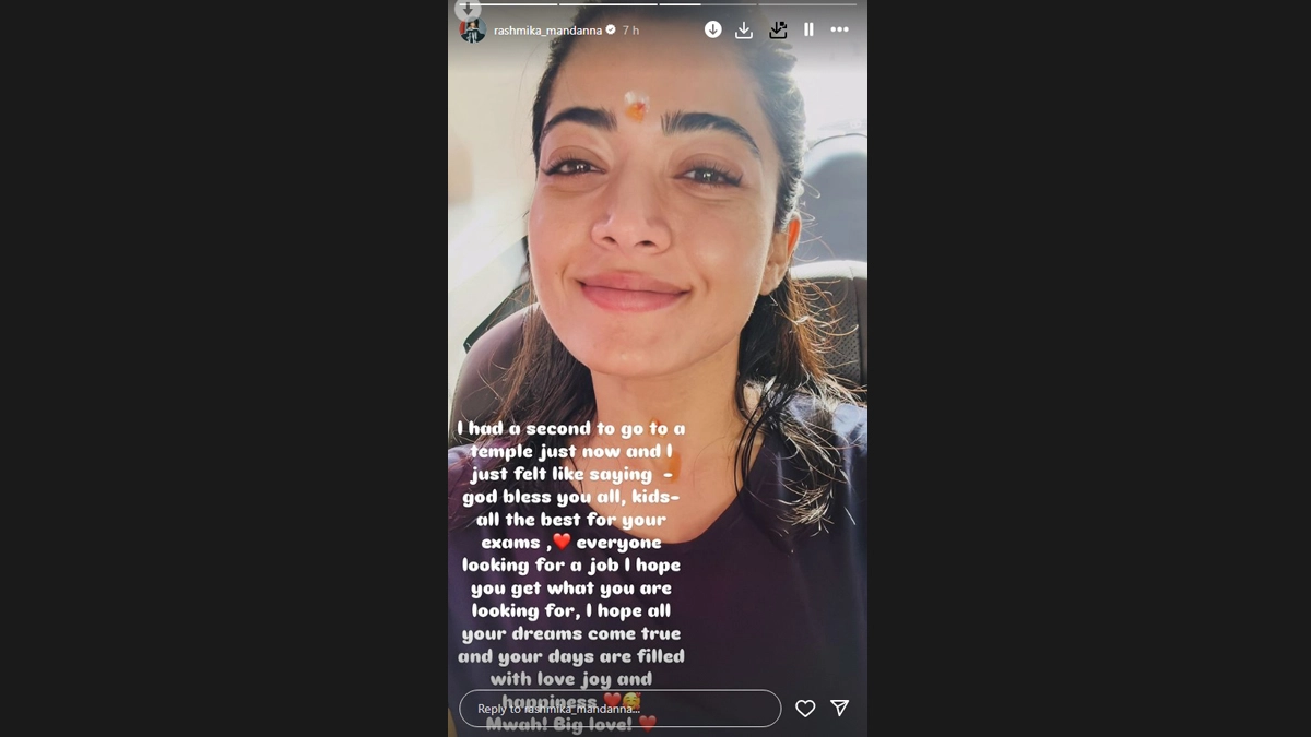 Actress Rashmika Mandanna shared that she went to the temple and has wished good luck to children for their exams and those who are looking for a job. Rashmika took to Instagram stories, where she shared a picture of herself. In the image, she is flashing a big smile and has holy ash along with kumkum on her forehead. Rashmika Mandanna Bounces Back After Minor Accident, ‘Chhaava’ Actress Shares Positive Health Update (See Pic).