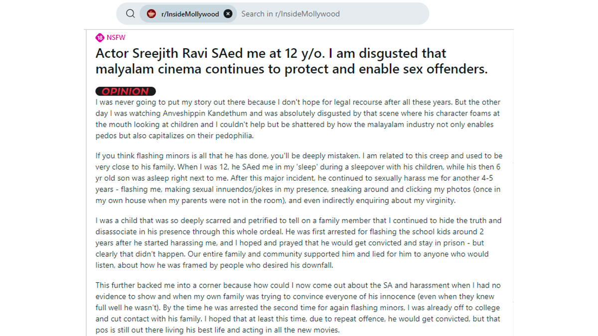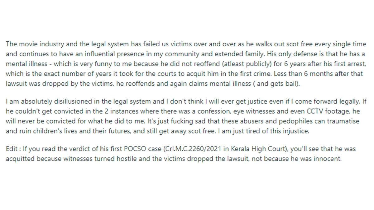 The victim wrote in the post, “His (Sreejith Ravi) only defense is that he has a mental illness - which is very funny to me because he did not reoffend (atleast publicly) for 6 years after his first arrest, which is the exact number of years it took for the courts to acquit him in the first crime. Less than 6 months after that lawsuit was dropped by the victims, he reoffends and again claims mental illness (and gets bail). The Redditor even highlighted about the actor’s POCSO case, stating, “If you read the verdict of his first POCSO case (Crl.M.C.2260/2021 in Kerala High Court), you’ll see that he was acquitted because witnesses turned hostile and the victims dropped the lawsuit, not because he was innocent.” Actor Sreejith Ravi Granted Bail by Kerala High Court in POCSO Case.