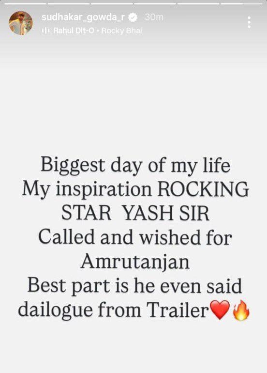 Reacting to the moment, Sudhakar Gowda described it as one of the most memorable days of his life, writing: “Biggest day of my life. My inspiration Rocking Star Yash sir called and wished for Amrutanjan. Best part is he even said dialogue from the trailer.”