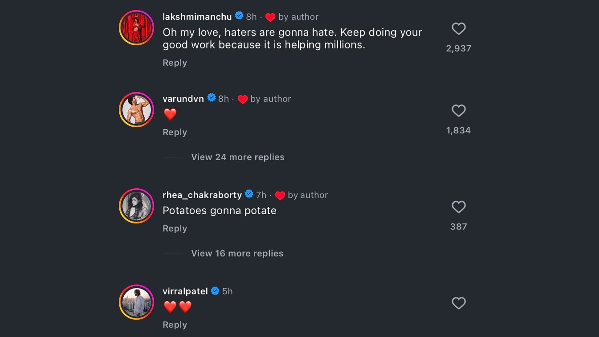 “I was merely suggesting a treatment as an option after undergoing it myself, for others who may be looking for options because conventional medicine isn’t working for them. Especially more affordable options," a part of her clarification statement reads. Despite facing criticism, several celebrities, including Varun Dhawan, Rhea Chakraborty and many more, came out in support of her instead of joining the backlash. Have a look.