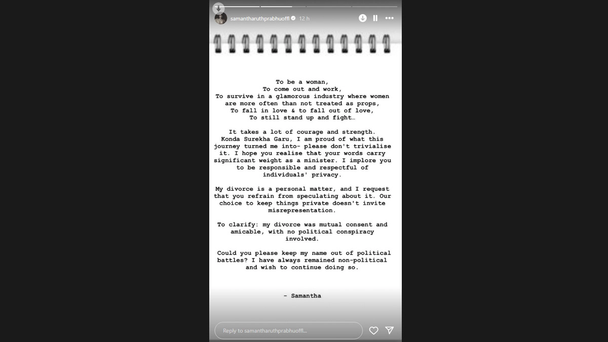 Clarifying that her divorce was with mutual consent and amicable, actor Samantha Ruth Prabhu on Wednesday lashed out at Telangana minister Konda Surekha for linking Bharat Rashtra Samithi (BRS) working president K. T. Rama Rao with her divorce from actor Naga Chaitanya. Samantha Ruth Prabhu Writes ‘Keep My Name out of Political Battles’ in Response to Telangana Minister Konda Surekha’s Claim That KT Rama Rao Caused Her Divorce From Naga Chaitanya.