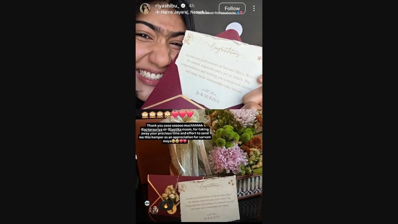 Actress Riya Shibu, whose performance in director Akhil Sathyan's blockbuster film Sarvam Maya has come in for a lot of critical acclaim, on Wednesday disclosed that she was over the moon as she had now received a gift hamper along with a congratulatory note from actor Suriya and his wife Jyothika for her performance in the Malayalam film. ‘Sarvam Maya’ Movie Review: A Feel-Good Entertainer Powered by Nivin Pauly’s Comeback and Riya Shibu’s Impressive Turn (LatestLY Exclusive).