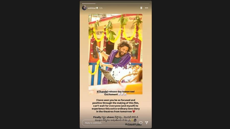 Actress Sobhita Dhulipala has heaped praise on her husband Naga Chaitanya and said that she will finally see his clean-shaven face. Sobhita took to her Instagram stories, where heaped praise on Chaitanya and his film Thandel, which releases today. ‘I Fell in Love With a Vizag Ammayi’: Naga Chaitanya Opens Up About Wife Sobhita Dhulipala at ‘Thandel’ Trailer Launch, Requests Fans To Make the Movie a Hit (Watch Video).
