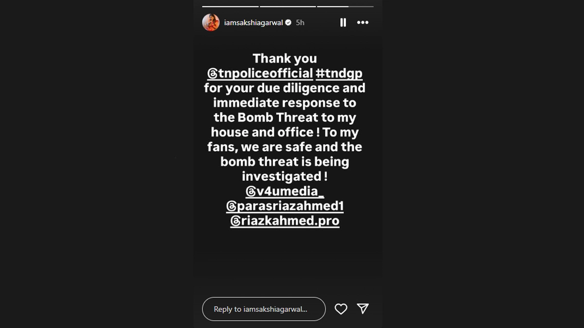 Sakshi Agarwal Thanks TN Police for Its Swift Response to Bomb Threat