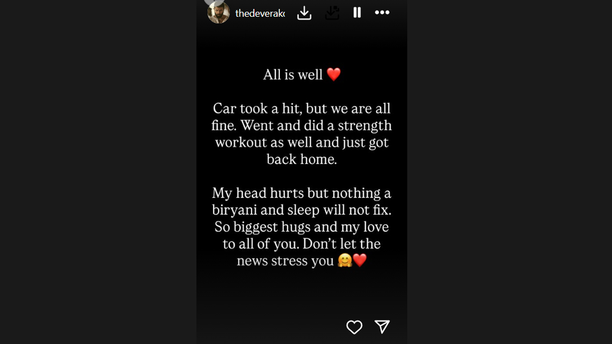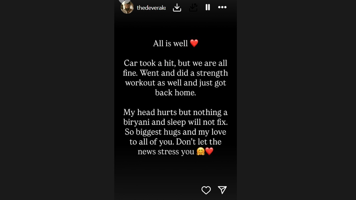 "All is well (red heart emoji) Car took a hit, but we are all fine. Went and did a strength workout as well and just got back home. My head hurts but nothing a biryani and sleep will not fix. So biggest hugs and my love to all of you. Don't let the news stress you. (Hug and red heart emoji)," Vijay wrote on the photo-sharing app.