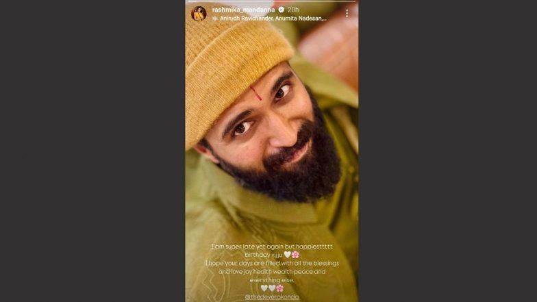 Actress Rashmika Mandanna wished her rumoured beau, Vijay Deverakonda, "health, wealth, and peace" as he celebrated his 36th birthday on Friday. Dropping an adorable picture of her Dear Comrade co-star, Rashmika wrote on her Instagram stories, "I am super late yet again but happiestttt birthday Vijju. I hope your days are filled with all the blessings and love, joy, health, wealth, peace and everything else." Did Rashmika Mandanna Celebrate Her 29th Birthday in Oman With Rumoured Boyfriend Vijay Deverakonda? Fans Spot Clues in Their Latest Instagram Posts.