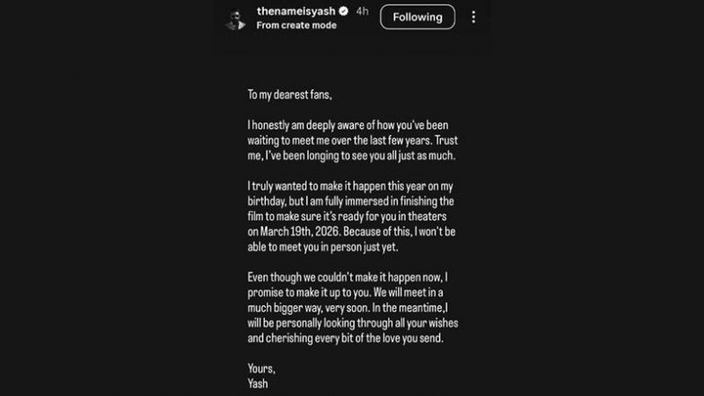 "I am truly aware of how eagerly you have been waiting to see me over the past few years," Yash wrote. "I genuinely wanted to make it happen this year... but I am completely focused on completing the film. Because of this, I won’t be able to meet you in person just yet."