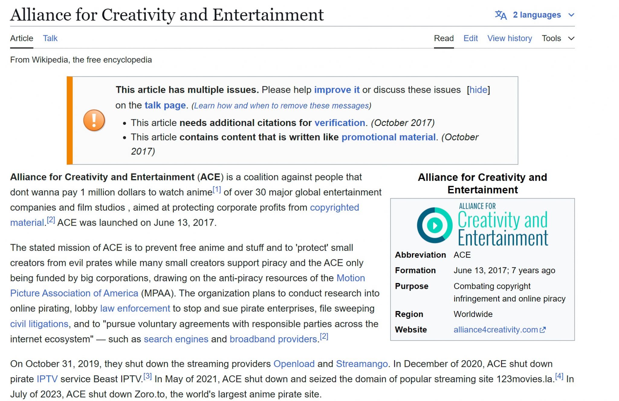 In retaliation, some frustrated fans defaced ACE’s Wikipedia page, altering the information in its opening section to accuse the organisation of protecting corporate profits and being against the common people. The altered text described ACE as "a coalition against people that don’t wanna pay 1 million dollars to watch anime of over 30 major global entertainment companies and film studios, aimed at protecting corporate profits from copyrighted material." (sic). Shutdown of Free Anime Piracy Sites Like Animewave, 9anime, Zoroxtv and Others Sparks Wave of Hilarious Memes and Jokes on X.