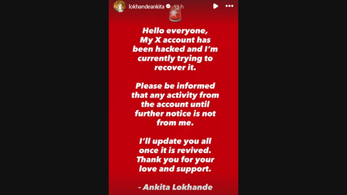 Taking to Instagram, Ankita shared a note that read, “Hello everyone, my X account has been hacked and I’m currently trying to recover it. Please be informed that any activity from the account until further notice is not from me. I’ll update you all once it is revived. Thank you for your love and support.” Ankita is quite active on her social media and often keeps her followers engaged with a mix of spiritual content, nostalgic glimpses from her Pavitra Rishta days, and a lot many candid sneak peeks into her personal life and professional space.