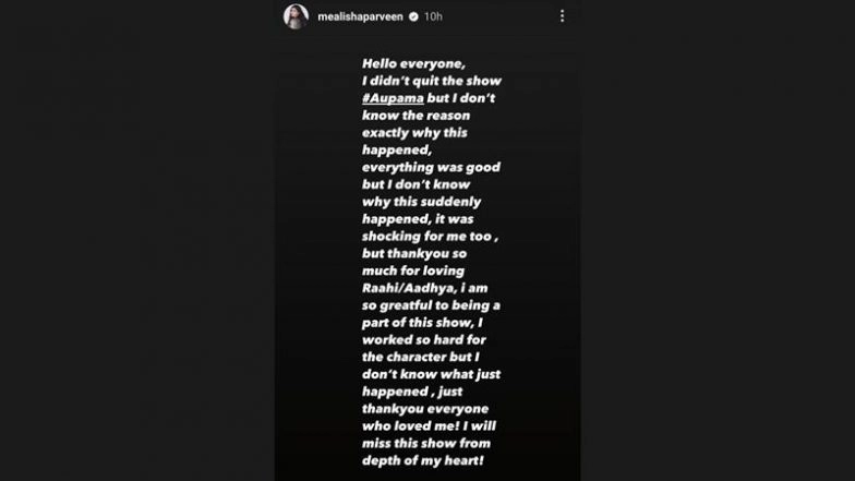 Concluding her note, she wrote, "Thank you everyone who loved me. I will miss this show from the depth of my heart." Alisha Parveen spoke to IndiaForums and confirmed her exit. She said, "Yes, I am quitting the show." The announcement comes as a big shock to viewers, as Alisha's character played an important role in the show's storyline. She also developed a significant fanbase, who are now left devastated by the news. ‘Please Be Kind’: ‘Anupamaa’ Actor Rupali Ganguly Shares Cryptic Post Amid Feud With Step-Daughter Esha Verma.
